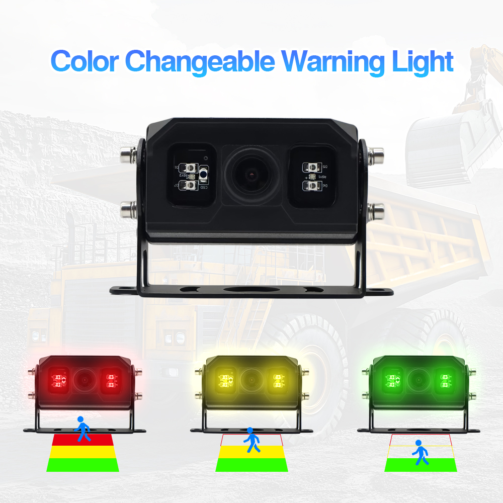 Kamera AI BSD ma wbudowaną lampkę ostrzegawczą zmieniającą kolor, która może zmienić kolor światła, gdy obiekt wejdzie w odpowiedni obszar wykrywania (czerwony, żółty, zielony).