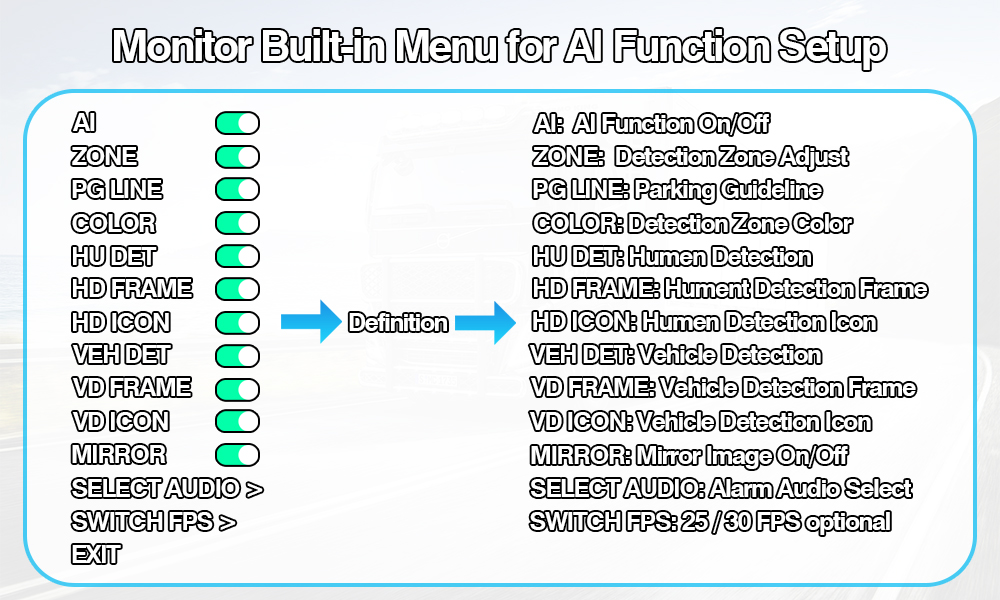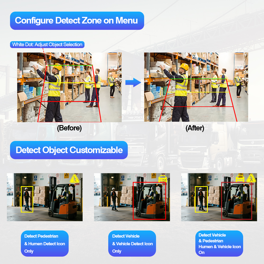 Kamera tylna z funkcją wykrywania martwego pola AI Wbudowana lampka ostrzegawcza zmieniająca kolorSystem kamer AI do wykrywania martwego pola Wbudowana lampka ostrzegawcza zmieniająca kolor to inteligentny zestaw bezpieczeństwa pojazdu obejmujący kamerę AI BSD i monitor AI obsługujący ustawienia kalibracji AI, umożliwiające użytkownikowi zmianę ustawień AI, takich jak dostosowanie rozmiaru obszaru detekcji, wybór rodzaju alarmu dźwiękowego, włączanie/wyłączanie wykrywania pieszych, włączanie/wyłączanie wykrywania pojazdów i wszelkich innych ustawień kalibracji.