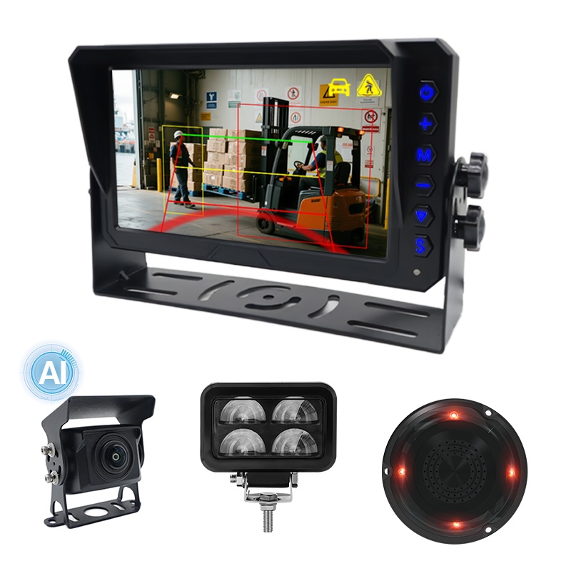 Kamera cofania z funkcją wykrywania martwego pola AI Wbudowany alarm dźwiękowy i świetlnyCarleader System kamer ostrzegawczych AI do wykrywania pieszych i pojazdów za pomocą lasera do wózków widłowych, system kamer AI BSD działający dla wózków widłowych, wyposażony w laserowe światło ostrzegawcze w kształcie litery U oraz alarm dźwiękowo-świetlny, które zapewniają lepszą wydajność ostrzegania otaczającego pieszego i pojazdu o opuszczeniu działającego wózka widłowego. System ten obsługuje funkcję wykrywania martwego pola AI, może wykryć pieszego i pojazd. Wbudowane menu kalibracji AI umożliwiające dostosowanie strefy wykrywania, włączenie/wyłączenie wykrywania pieszych, włączenie/wyłączenie wykrywania pojazdów itp. Zaawansowane rozwiązanie zwiększające bezpieczeństwo pracy wózka widłowego.
