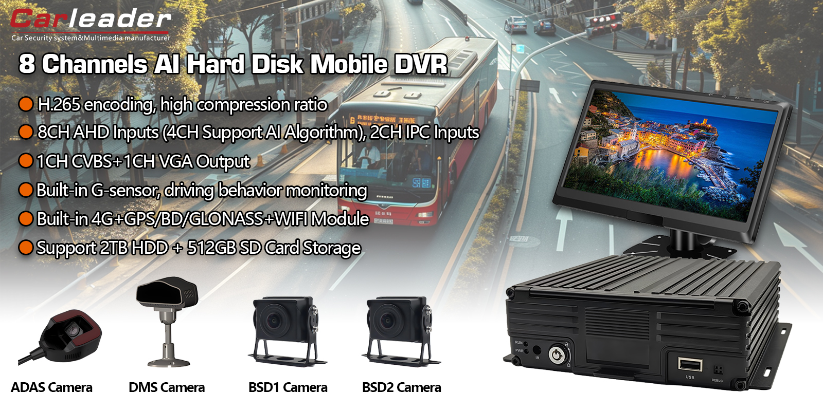 Przedstawiamy CarleaderaMobilny rejestrator DVR z 8-kanałowym dyskiem AI, obsługa ADAS+DMS+BSD, 8-kanałowy, wysokiej klasy cyfrowy rejestrator wideo z dyskiem twardym, zaprojektowany z myślą o profesjonalnym nadzorze pojazdów i inteligentnym zarządzaniu flotą. Łączenie solidnej konstrukcji sprzętu z zaawansowanymi algorytmami AI, w tym ADAS, DSM, BSD. Zapewnia niezawodne nagrywanie wideo wysokiej jakości, kompleksowe wsparcie kierowcy i proaktywne monitorowanie bezpieczeństwa – a wszystko to w jednym, zintegrowanym systemie.