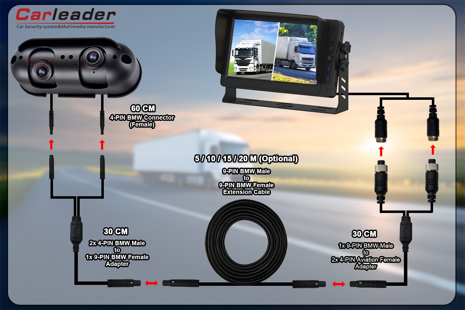 Pierwsze rozwiązanie wykorzystuje tylko jeden przedłużacz (9-pinowe złącze BMW), kabel rozdzielony 1 na 2 po obu stronach, aby podłączyć kamerę i monitor. Ponieważ w tym rozwiązaniu mamy tylko przedłużacz, co sprawia, że proces okablowania jest łatwiejszy i wygodniejszy.