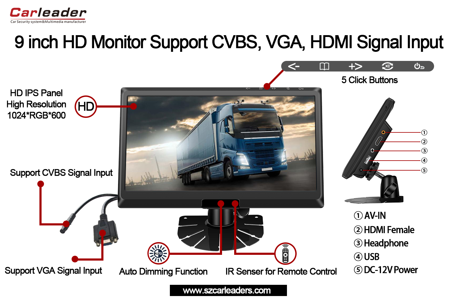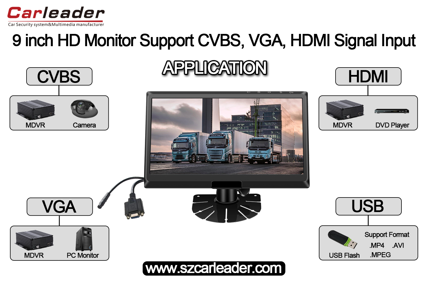 CarleaderMonitor HD z ekranem IPS o przekątnej 9 cali i obsługą wejść CVBS+HD+VGAto wysokiej jakości monitor HD przeznaczony do monitorowania pojazdów i zarządzania flotą MDVR. Monitor samochodowy obsługuje wejścia sygnału CVBS, HD i VGA. A jeśli MDVR ma interfejs VGA lub HD, można go używać z 9-calowym monitorem samochodowym IPS.