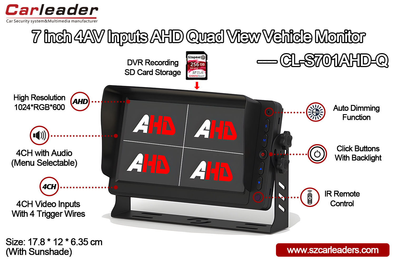 Carleader z dumą przedstawia Państwu nasze7-calowy monitor z 4 kanałami AHD i wyświetlaczem Quad ViewKonstrukcja z czterema widokami może obsługiwać 4 kanały dla kamery pojazdu, takie jak widok z przodu, widok z boku x2, widok z tyłu, umożliwia kierowcom dużych pojazdów (autobusów, ciężarówek i samochodów dostawczych monitorowanie wielu widoków otoczenia podczas prowadzenia pojazdu).
