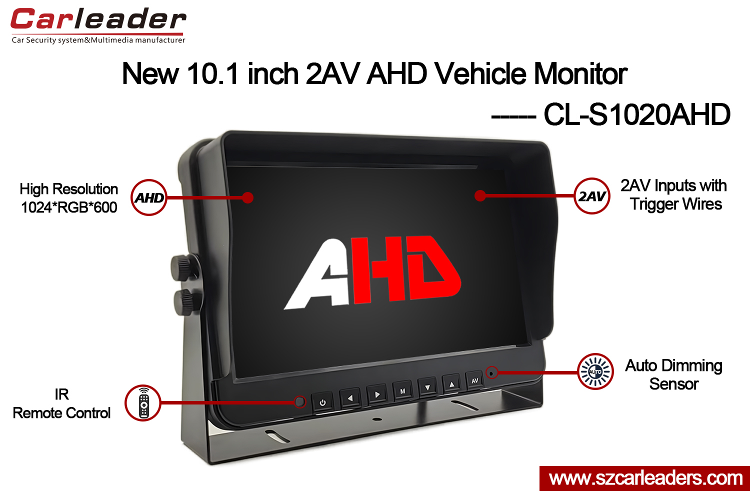 Carleader10,1-calowy monitor zapasowy pojazdu z 2 kanałami AHDnadaje się do samochodów ciężarowych, autobusów, samochodów dostawczych, pojazdów kempingowych, autobusów szkolnych, maszyn rolniczych, maszyn budowlanych, sprzętu sanitarnego itp.