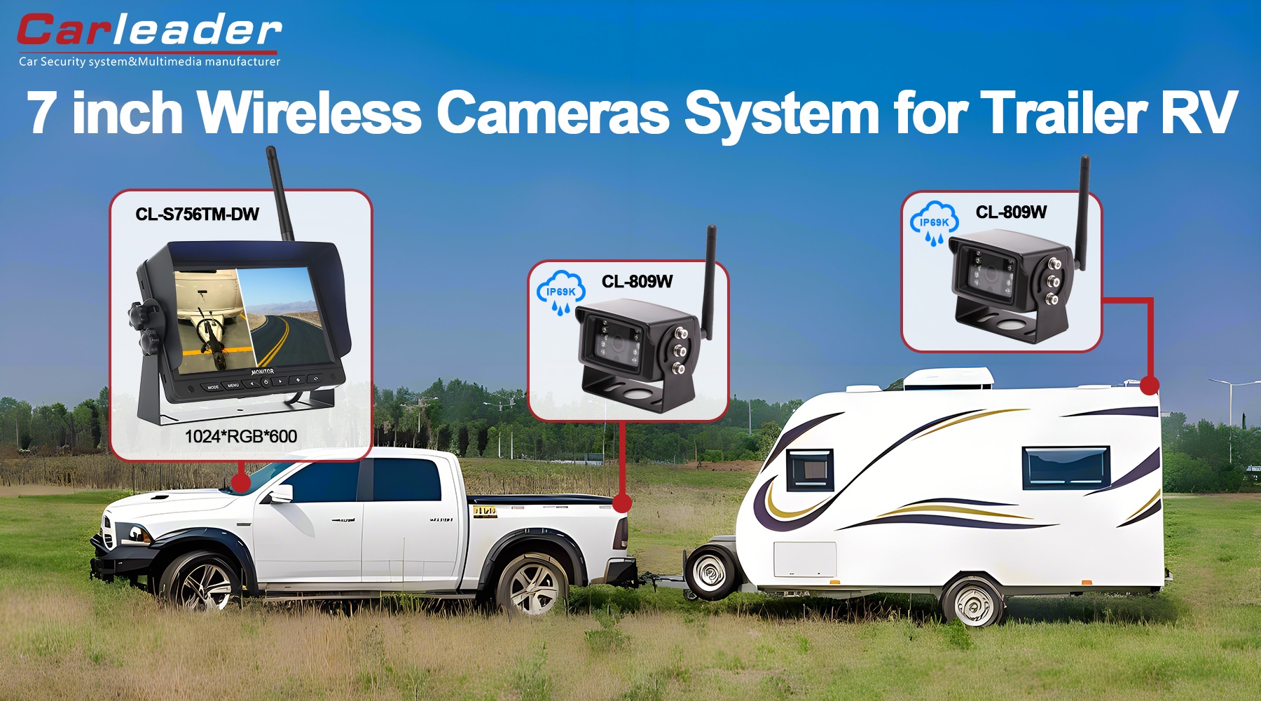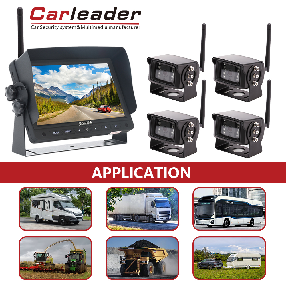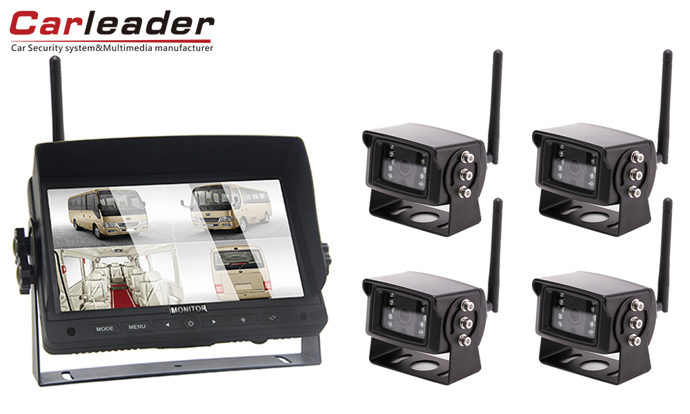 Carleader7-calowy cyfrowy bezprzewodowy system kamer 2-kanałowych z dzielonym wyświetlaczem 2,4G, Wysokowydajny bezprzewodowy system monitorowania z obsługą 2 widoków na wyświetlaczu, współpracujący z 2-częściową kamerą bezprzewodową. 7-calowy panel cyfrowy, współczynnik obrazu 16:9, rozdzielczość 1024 x 600 (RGB), zapewnia kierowcy wysoką przejrzystość podczas jazdy.