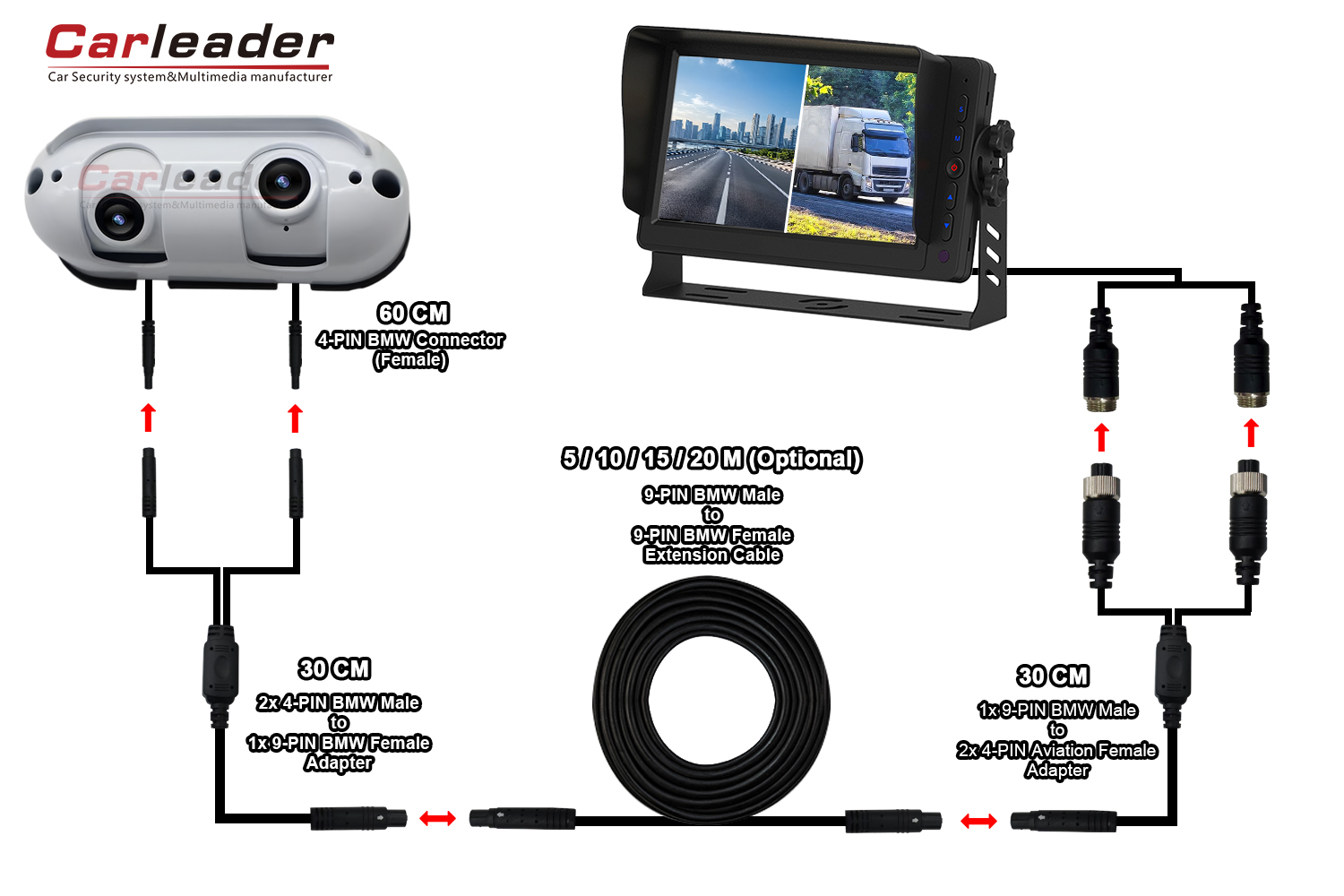 Pierwsze rozwiązanie wykorzystuje tylko jeden przedłużacz (9-pinowe złącze BMW), kabel rozdzielony 1 na 2 po obu stronach, aby podłączyć kamerę i monitor. Ponieważ w tym rozwiązaniu mamy tylko przedłużacz, co sprawia, że proces okablowania jest łatwiejszy i wygodniejszy.