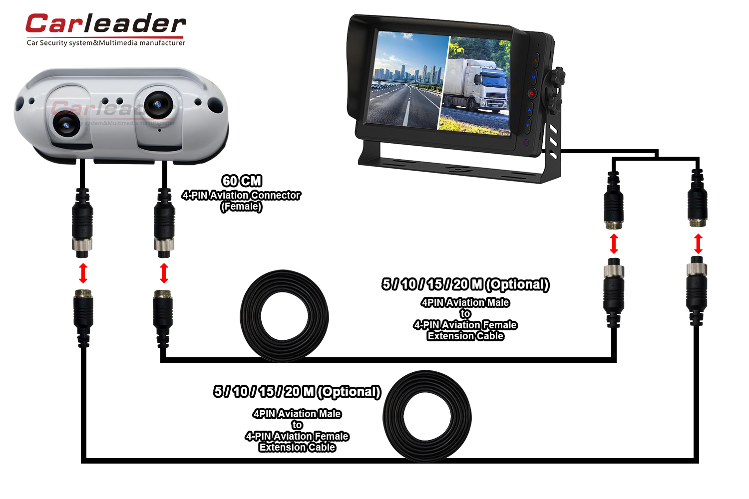 Carleaderoferuje dwa różne rozwiązania okablowania dla wytrzymałej kamery cofania AHD Starlight z dwoma obiektywami, aby dopasować się do różnych potrzeb w zakresie okablowania: