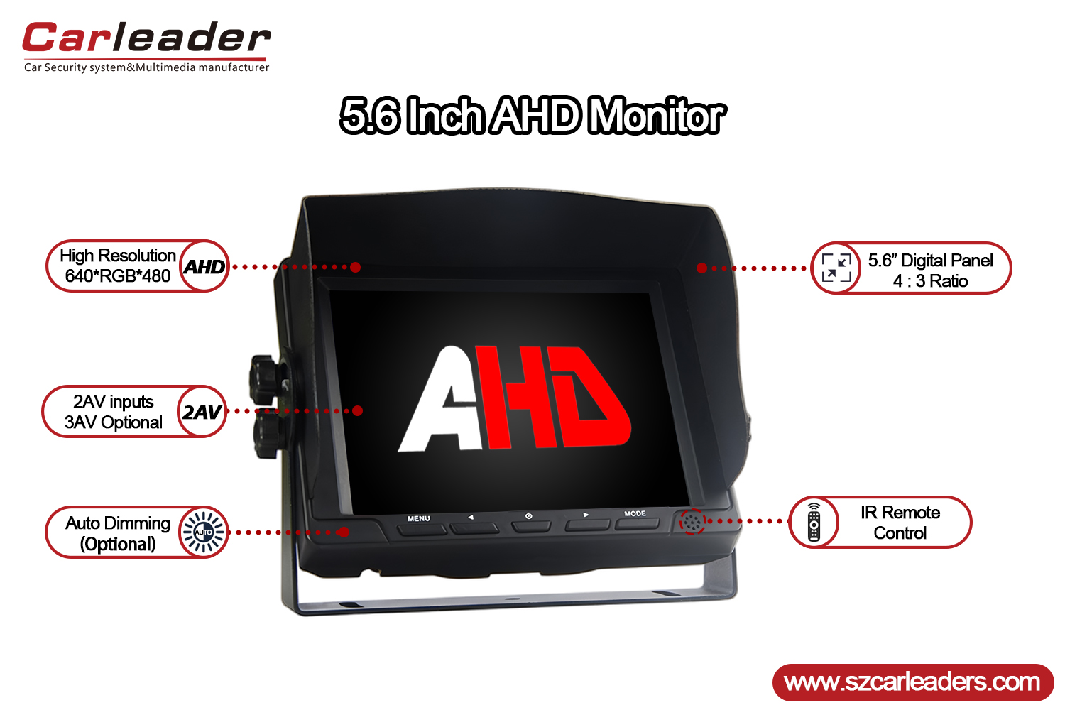 Carleader5,6-calowy monitor zapasowy pojazdu z 2 kanałami AHDto profesjonalny ekran o przekątnej 5,6 calaMonitor cofania AHD, zaprojektowane w celu zapewnienia wyraźnego i niezawodnego obrazu dla systemów bezpieczeństwa i monitorowania pojazdów. Dzięki nowoczesnemu wzornictwu i solidnej funkcjonalności jest idealnym rozwiązaniem dla pojazdów komercyjnych i prywatnych wymagających niezawodnego widzenia do tyłu.