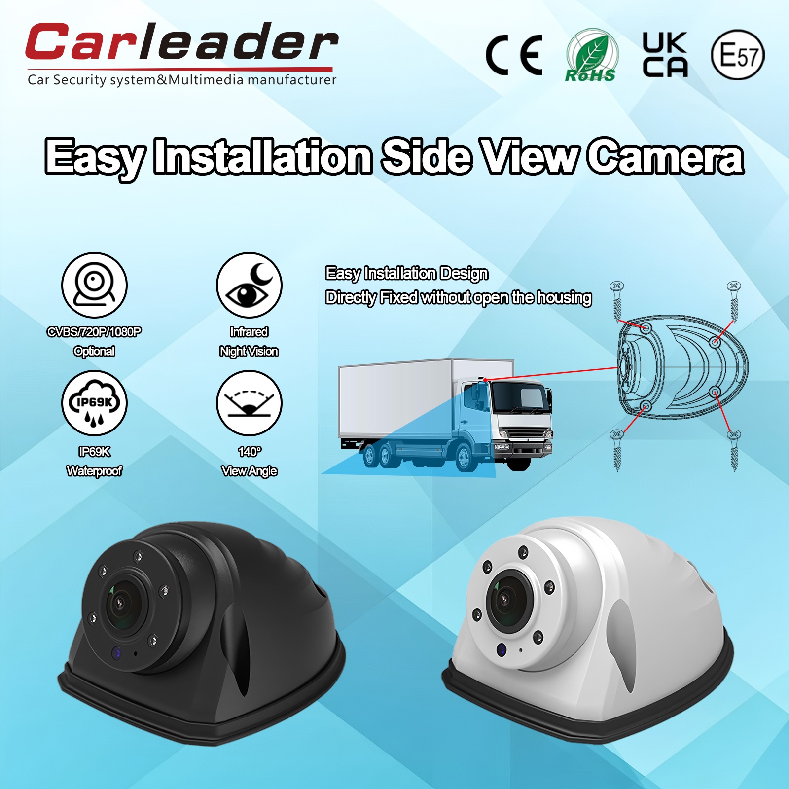 CarleaderKamera AHD do szybkiego montażu, wytrzymała, z widokiem z boku, białato wysokiej klasy kamera AHD z widokiem bocznym, zaprojektowana tak, aby zapewnić dobrą widoczność w każdych trudnych warunkach pogodowych. Ten kompaktowy system kamer, zaprojektowany głównie ze względu na wielofunkcyjność i trwałość, nadaje się do pojazdów użytkowych, urządzeń przemysłowych i zastosowań związanych z bezpieczeństwem, gdzie potrzebne jest wyraźne widzenie peryferyjne.